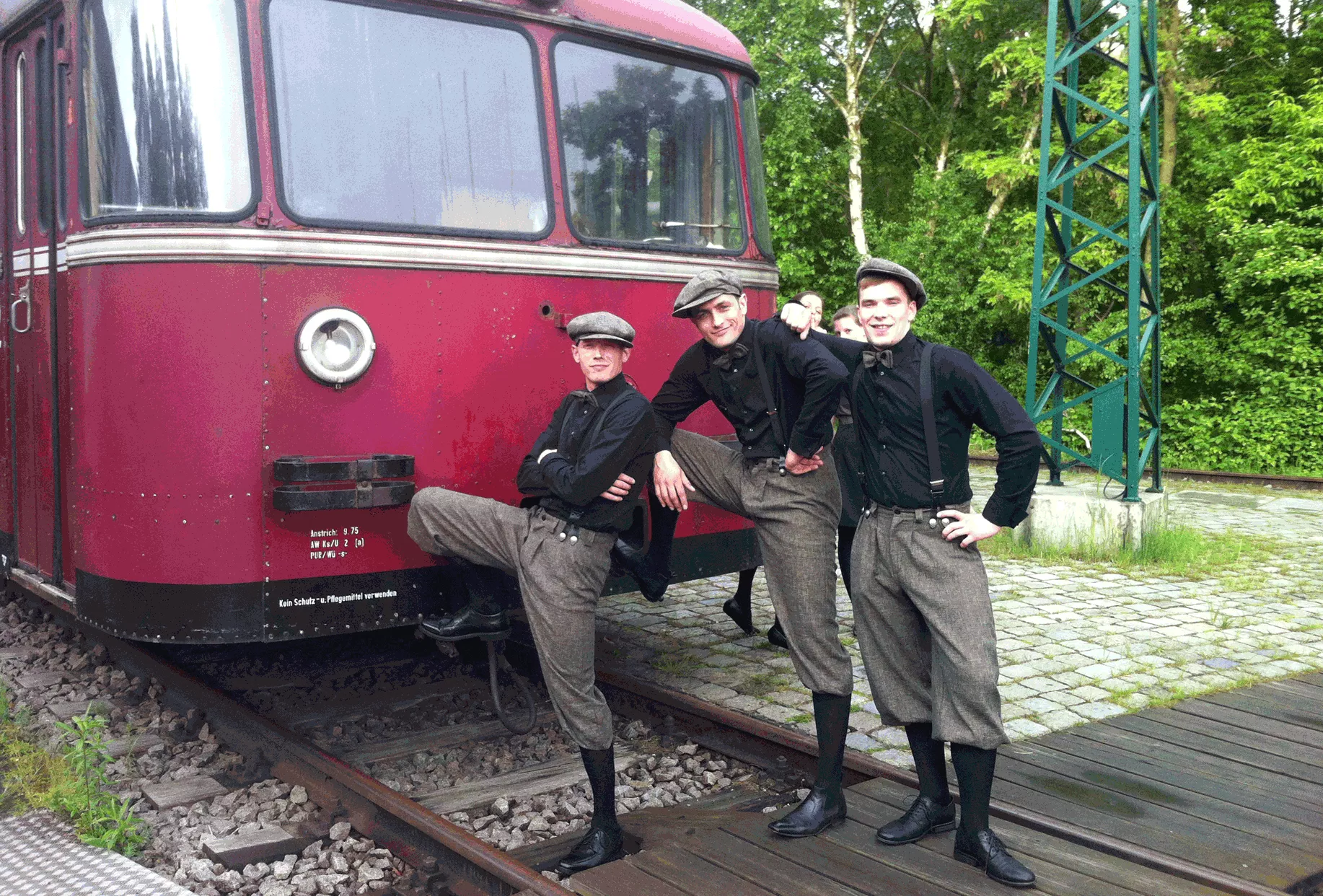 Frauen begeisterten damals mit Flapper-Kleidern, häufig kürzer geschnitten und reich verziert mit Fransen oder Pailletten. Männer kleideten sich in elegante Anzüge, oft kombiniert mit schmalen Krawatten oder Bowties.
